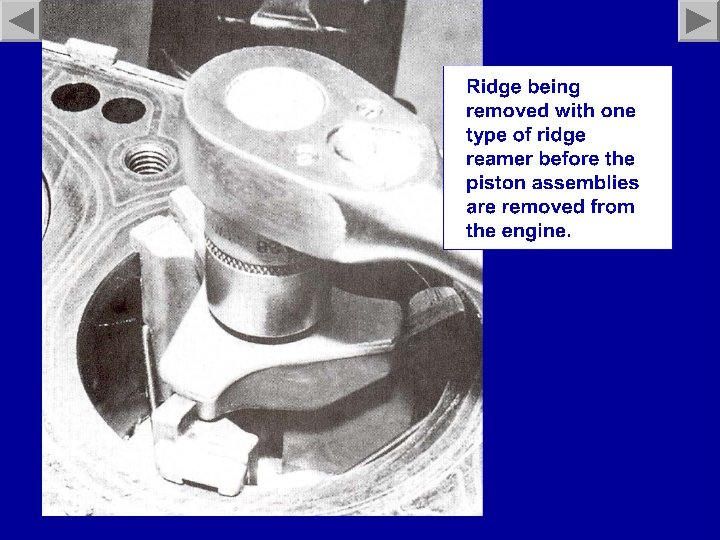 Cylinder Boring • Cylinders are usually tapered after extensive usage. • Most of the wear will occur at the top of the cylinder, just under the ridge. – Though not highly advised, the ridge may be removed with a “ridge-reamer” for piston removal. • The engine must be “bored” and new pistons fitted if the cylinder is out of specification.