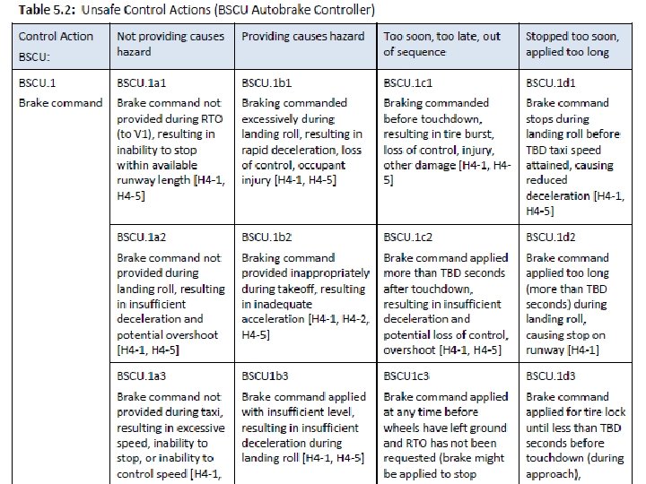 Aircraft Braking System Hazard H 4: An aircraft on the ground comes too close to moving or stationary objects or inadvertently leaves the taxiway. Deceleration-related hazards: • H 4 -1: Inadequate aircraft deceleration upon landing, rejected takeoff, or taxiing • H 4 -2: Deceleration after the V 1 point during takeoff • H 4 -3: Aircraft motion when aircraft is parked • H 4 -4: Unintentional aircraft directional control (differential braking) • H 4 -5: Aircraft maneuvers out of safe regions (taxiway, runways, terminal gates, ramps, etc. • H 4 -6: Main gear rotation is not stopped when (continues after) the gear is retracted.