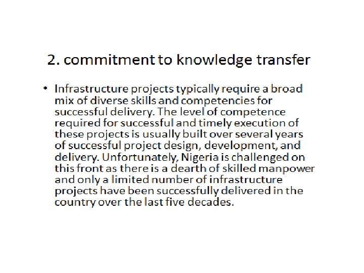 • Increased maintenance and capacity expansions are needed to improve the current state of Nigeria’s infrastructure, so as to strengthen the intermodal transport of goods and passengers, would improve the safety, convenience, travel time and cost of Nigerian transportation and reduce carbon/particulate emissions.