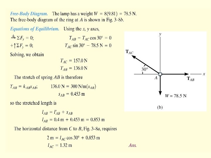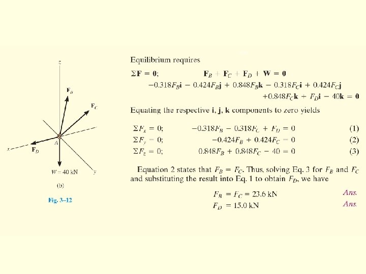 Solution: 2. Equations of equilibrium 1. FBD of point A z Express each force in Cartesian vector form 10 m C 8 m FB = FBu. B N 1. 2 m B FC P = Pj N W = -1962 k N P FB A 12 m (W = 200 kg x 9. 81 m/s 2 = 1962 N) 2 m y W x FC = FC u. C N Coordinates for points A, B, and C: A (0, 1. 2, 2); B (8, 0, 12); C (-10, 0, 12)