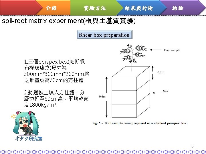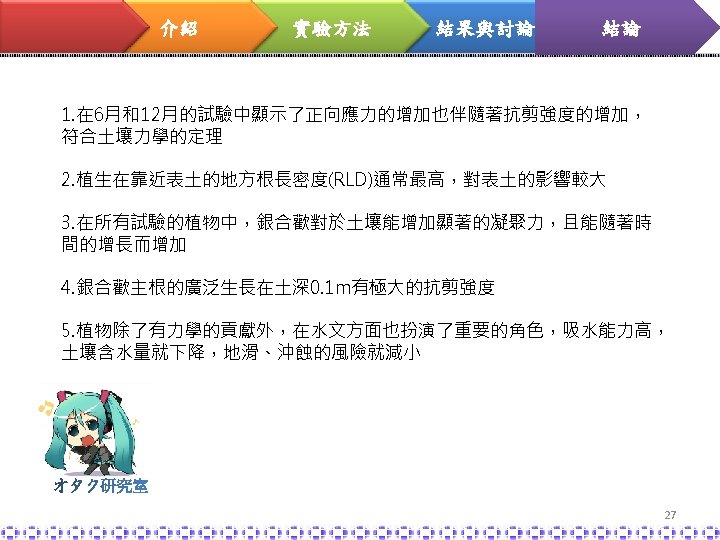介紹 實驗方法 結果與討論 結論 soil-root matrix L. leucocephala Shear strength, cohesion and friction factors 植物生長 6個月 後,對土壤的 摩擦角並沒有 太大的影響 18