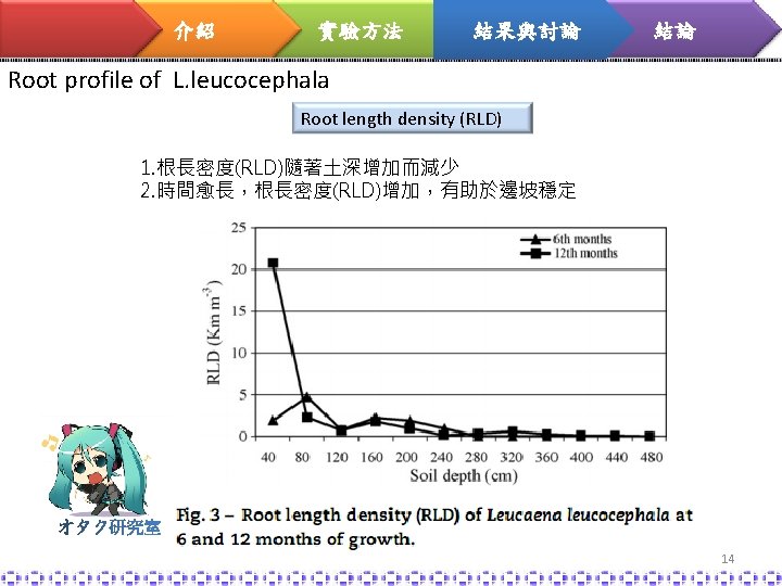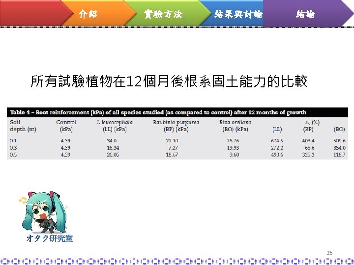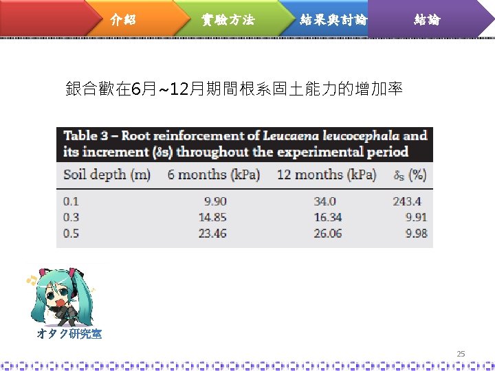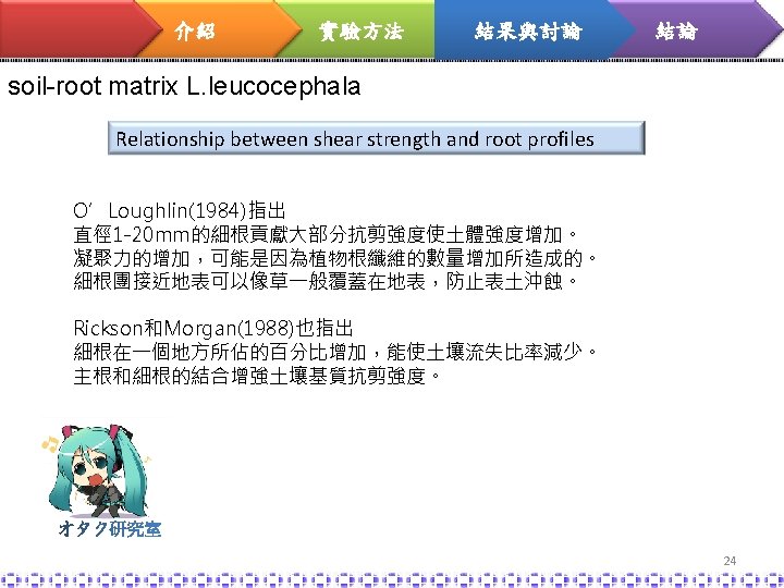 介紹 實驗方法 結果與討論 結論 soil-root matrix L. leucocephala Relationship between shear strength and root profiles 植物的根在到達土 深 60 cm時的根密 度,可增加土壤抗 剪強度進而穩定土 壤,減少表土沖蝕 23