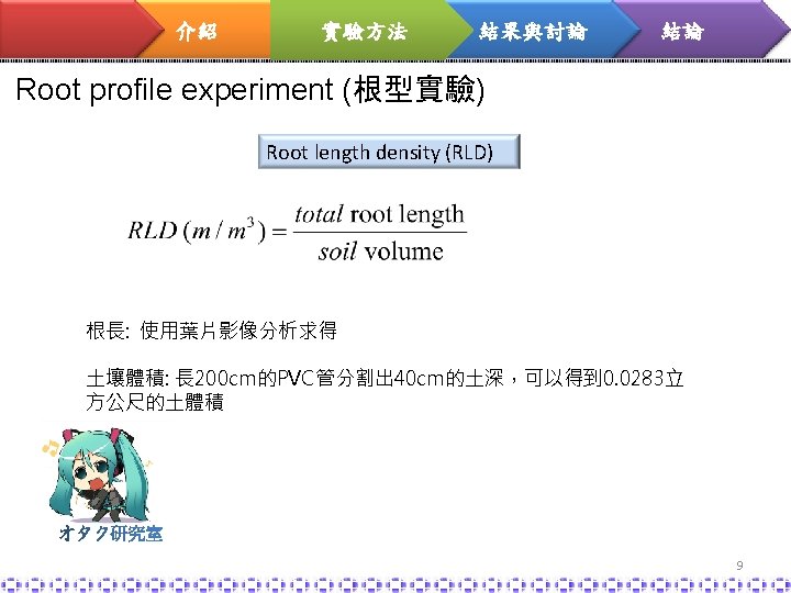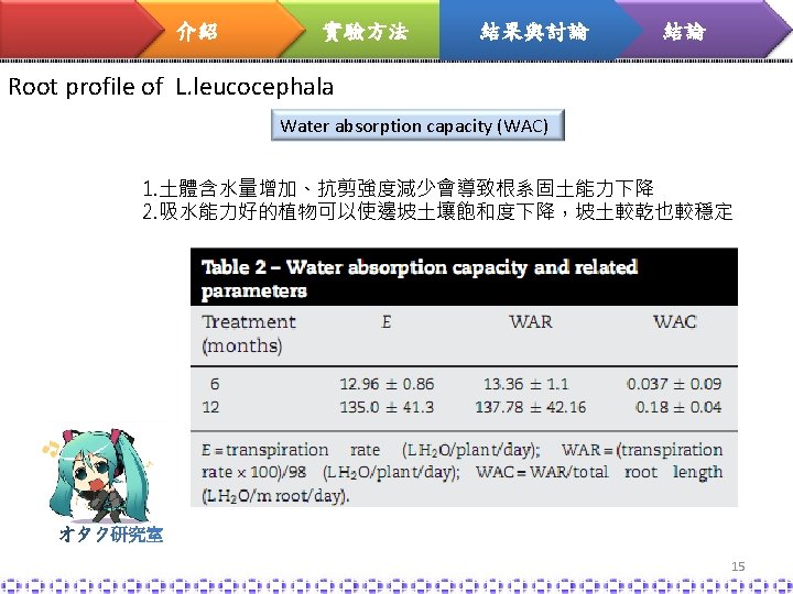 介紹 實驗方法 結果與討論 結論 Root profile experiment (根型實驗) Water absorption capacity (WAC) 根據Baker(1994)的定理,根吸收的水有98%蒸散至大氣 10