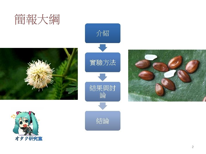 Engineering properties of Leucaena leucocephala for prevention of slope failure 銀合歡的 程特性預防邊坡破壞 O. Normaniza*, H. A. Faisal, S. S. Barakbah 第八組 邱倍堅 7099042008 江志文 7099042027 1