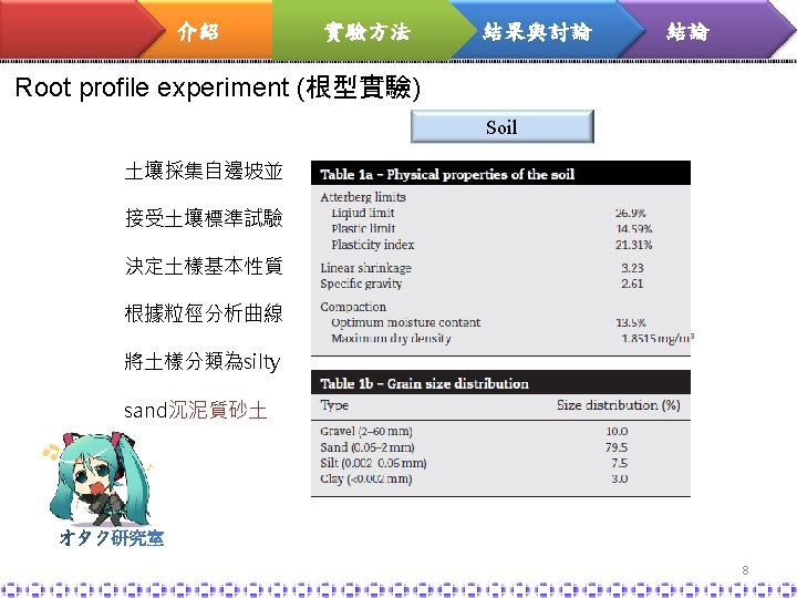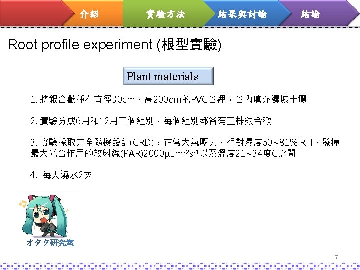 介紹 實驗方法 結果與討論 結論 實驗目的 The objective of this paper is to quantify(量化) the root effect to slope stability in terms of root profile (根型對於邊坡穩定的影響) and root reinforcement capacity of the species studied. (根種類對固土能力的評估) 方法 1. Root profile experiment (根型實驗) 2. soil-root matrix experiment(根與土基質實驗) 6