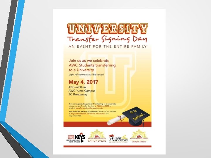 University Transfer Signing Day May 4, 2017, 4: 00 -6: 00 pm • Special recognition for Transfer students graduating in Spring and Summer 2017 and have been admitted to one of our partner universities for Fall 2017. • Sign up today!