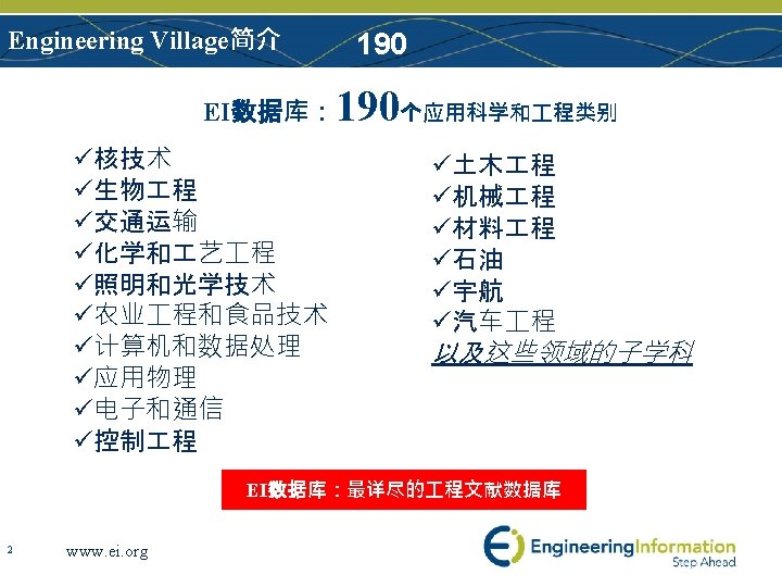 Engineering Village简介 Engineering Village 2平台 共包括约 12个数据库 3 www. ei. org