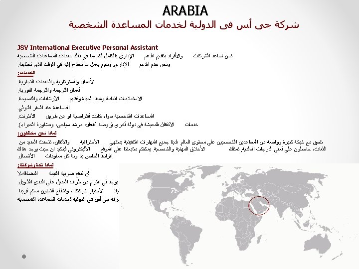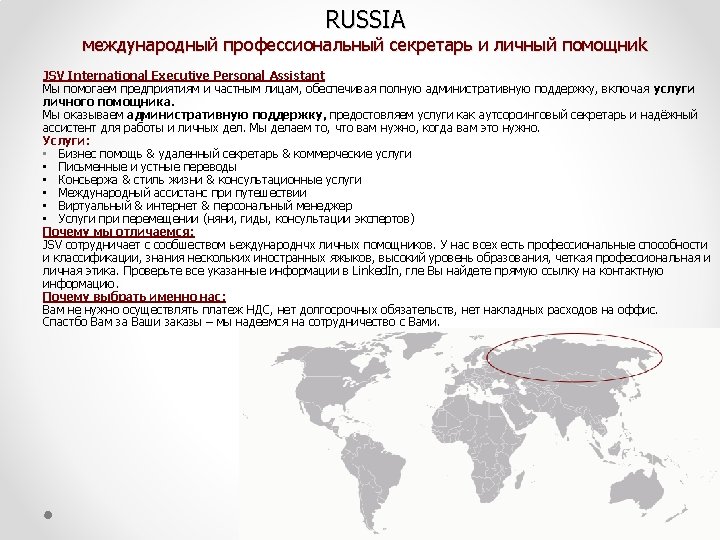 ROMANIA Asistenţă Executivă Internaţională JSV International Executive Personal Assistant Venim în sprijinul firmelor şi al persoanelor fizice prin oferirea de asistenţă administrativă completă, inclusiv Servicii de Asistenţă Personală. Noi vă oferim Asistenţă Admistrativă Vă stăm la dispoziţia Dumneavostră atunci când aveţi nevoie, unde aveţi nevoie cu ce aveţi nevoie. Internațional, 24. 7. Servicii: • Servicii Comerciale, Secretariat, respectiv Intermedieri Afaceri • Traduceri Scrise şi Simultane • Administrare & Stil de viață & Consiliere de Afaceri • Asistență pentru Călătorii Internaţionale • Asistent Personal sau Virtual/Online • Servicii de Relocare (babysitting, ghiduri, consultanţă legală etc. ) De ce suntem diferiți: JSV vă stă la dispoziţie cu un număr larg de profesionişti cu experienţă internaţională. Toţi colaboratorii JSV au experienţă vastă in servicii executive, stăpânesc mai multe limbi stăine, sunt educaţi la nivel înalt, dispun de un grad mare de etică profesională şi morală. Toţi colaboratorii noştri au recomandări impecabile, vă puteti convinge de toate acestea verificând profilele lor personale Linked. In, acolo unde veţi găsi şi datele lor de contact. De ce să ne alegeţi: Nu se plăteşte TVA; Nu se impun angajamente pe termen lung; Nu există cheltuieli administrative. Vă mulțumesc anticipat pentru că aţi les JSV.