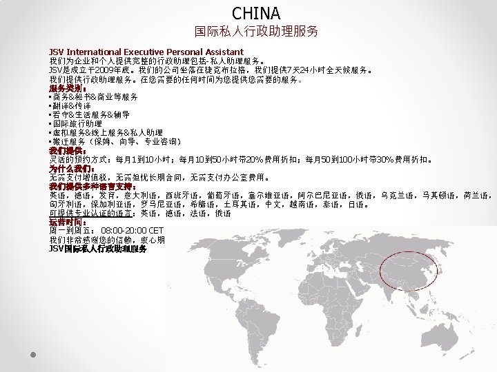 CZECH REPUBLIC JSV Osobní asistentka v Praze JSV International Executive Personal Assistant Nabízíme služby Osobní asistentky, mezinárodně. Poskytujeme komplexní administrativní a asistentskou podporu firmám, CEO, Poslancům, Ministrům a podnikatelům. Služba je postavena na principu najmutí si Osobní Asistentky na částečný úvazek, ad hoc úkoly, pružné a flexibilní se zkušenostmi a znalostí jazyků. Založeno konec roku 2009. Služby: • Administrativní & Sekretářské & Obchodní služby • Překladatelství & Tlumočení • Concierge & Životní styl & Poradenství • Mezinárodní cestovní asistentka • Virtuální & Online & Osobní asistentka V čem se lišíme: JSV spolupracuje s mnoha mezinárodními executive osobními asistentkami. Všechny asistentky mají profesionální znalosti s dovednosti, znalosti světových jazyků, vysokou míru vzdělání a profesionálního etického kodexu (chování). Zjistěte veškeré údaje (informace) na Linked. In profilech, kde naleznete veškeré informace a přímé kontakty. Proč si vybrat nás: Nejsme plátci DPH. Nejste vázání dlouhodobým pracovním závazkem. Neplatíte žádné další kancelářské výdaje. Děkujeme velice za Vaše kontaktování a těšíme se na spolupráci.