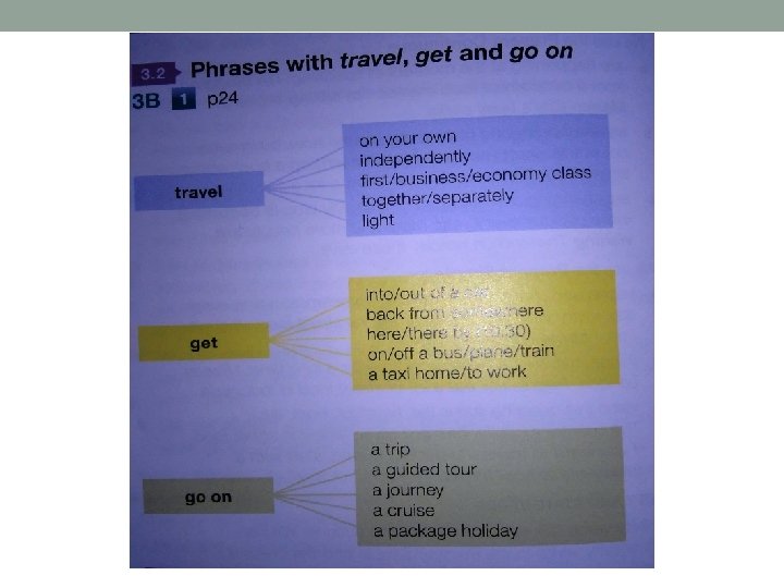 Vežba za 3 B Phrases with TRAVEL, GET and GO ON 1. ______ back from somewhere. 2. ______ a trip. 3. ______ a taxi home. 4. ______ independently. 5. ______ off a bus. 6. ______ a cruise. 7. ______ economy class. 8. ______ a guided tour. 9. ______ light. 1. get, 2. go on, 3. get, 4. get, 5. go on, 6. go on, 7. travel, 8. go on, 9. travel