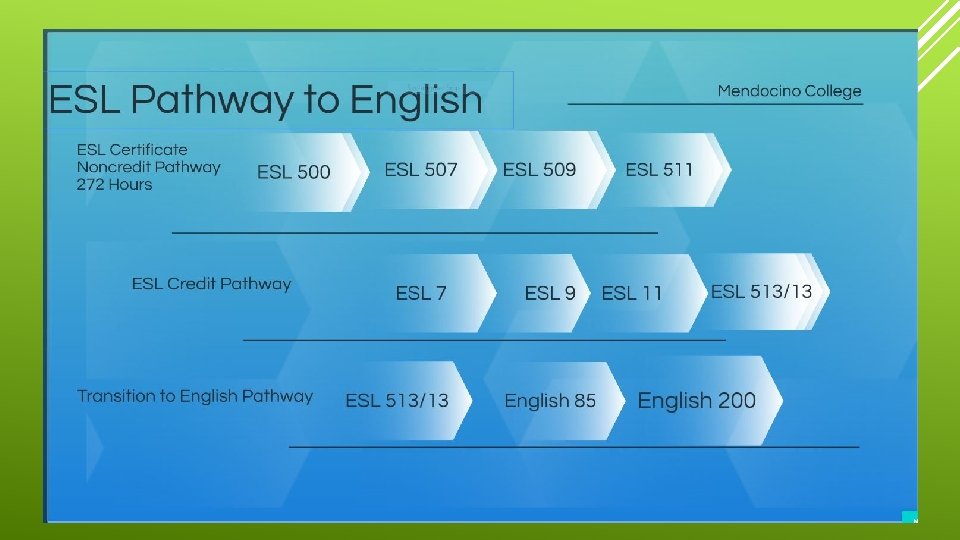 English 200 This course will fulfill the requirements of the first semester of freshman composition at the university level. All sections are both writing and reading intensive. Topics covered include thesis development and support, writing essays in various rhetorical modes, close reading, and completion of a thorough, properly cited research paper. • The standard expectation for the course is a minimum of 6, 000 words of formal writing, distributed among no fewer than three revised essays, in-class timed essays, plus a longer research paper. English 85 This course will prepare students for transfer-level college writing. Students will review English fundamentals, read analyze professional essays, and write essays with an emphasis on exposition and critical thinking and access student services. • The standard expectation for the course is a minimum of 4, 000 words of formal writing, distributed among no fewer than three revised essays, in-class timed essays, plus a longer research paper. ESL 13 This course will prepare multilingual students for ENG 85 coursework. This course focuses on the development of engaged reading, critical thinking, and the development of writing skills through participation in the academic writing process. This course will focus on common challenges and themes with particular relevance for multilingual writers, with specific focus on 2 nd language acquisition and the brain, language and society, and grammatical error patterns which may interfere with meaning. • The standard expectation for the course is a minimum of 3, 000 words of writing, distributed among shorter writings, essays, and a research project.