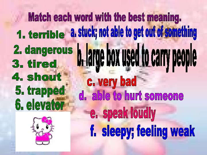 ����� B: : Complete the passage with items from the box. One item is extra. got in tired shout ended up terrible trapped terrible A man in England had a (1)……………… experience with an elevator at his office. got in After he (2)…………. the elevator, trapped it broke and he was (3)…………………. shout The man tried to (4)…………for help, but it was a holiday so no one was in ended up the building. He (5)…………………. . staying in the elevator for more than sixty hours, without any food or water.