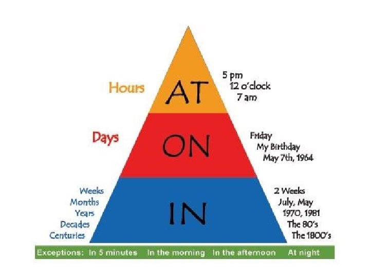 Time Words o Ago: 2 days ago, 6 years ago, 2 minutes ago • o Just recently a while ago a long time ago • o o Ago means in the past A small amount, medium amount, and large amount of time in the past Last: Last Wednesday, last night, last week • The time before this, the Wednesday before now, the week before now • Do not use last day, use yesterday Next: Next Thursday, next year, next Christmas • Do not next afternoon, use tomorrow afternoon o Soon: A short time in the future o In a few: In a few weeks, in a few years, in a few minutes • “In a few” is in the future, “In just a few” is a short time in the future