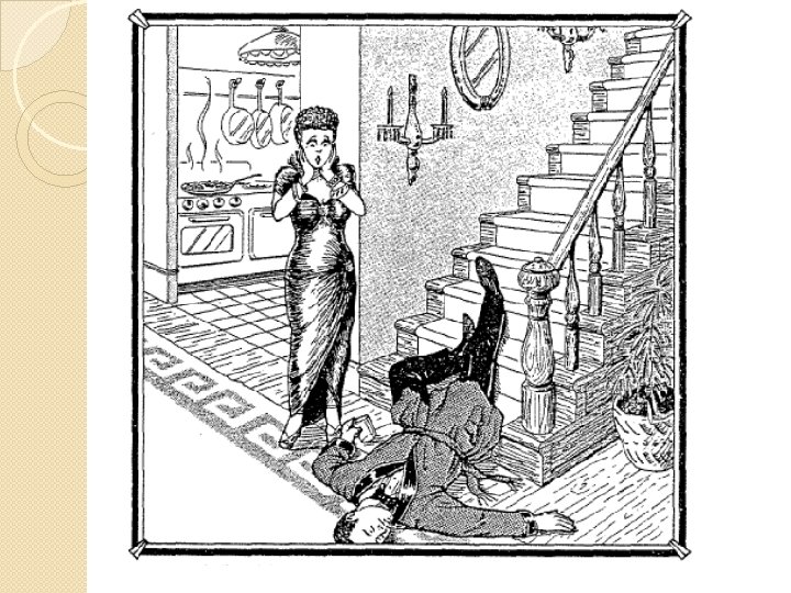 � At five-feet-six and a hundred and ten pounds, Queenie Volupides was very pretty. When she ran out of the house after a fight with her husband, Arthur, she went to the country club where there was a party going on. � She left the club shortly before one in the morning and invited a few friends to follow her home and have one more drink. � They got to the Johnson house about ten minutes after Queenie, who met them at the door and said, “Something terrible happened. Arthur slipped and fell on the stairs. He was coming down for another drink—he still had the glass in his hand—and I think he’s dead. Oh, my God—what shall I do? The autopsy conducted later concluded that Arthur had died from a wound on the head and confirmed that he’d been drunk. Is Queenie lying? �