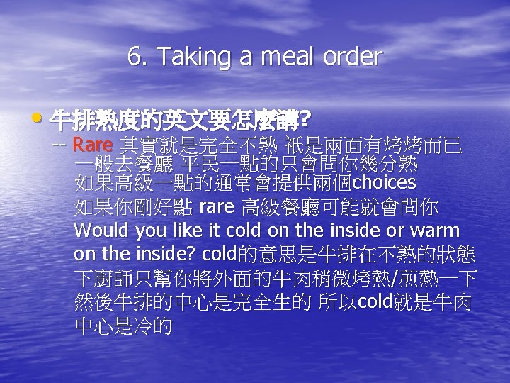 6. Taking a meal order • 牛排熟度的英文要怎麼講? -- Rare: Red and cool on the inside (牛排外面跟 裡面都是冷的, 大概 二分熟) -- Medium Rare: Red and warm on the inside (三 ~四分熟, 外冷牛排內有點微熟) -- Medium: Pink and hot on the inside (五分熟) -- Medium Well: Slightly pink and hot on the inside (七到八分熟, 裡面牛肉有熟可是沒有完 全熟透) -- Well Done: Cooked throughout (全熟)
