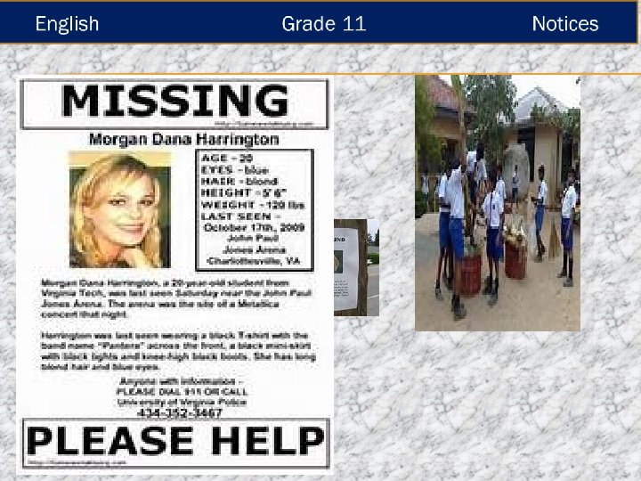 English Grade 11 1. What was lost? 2’What colour was it? 3. Other details ? Notices