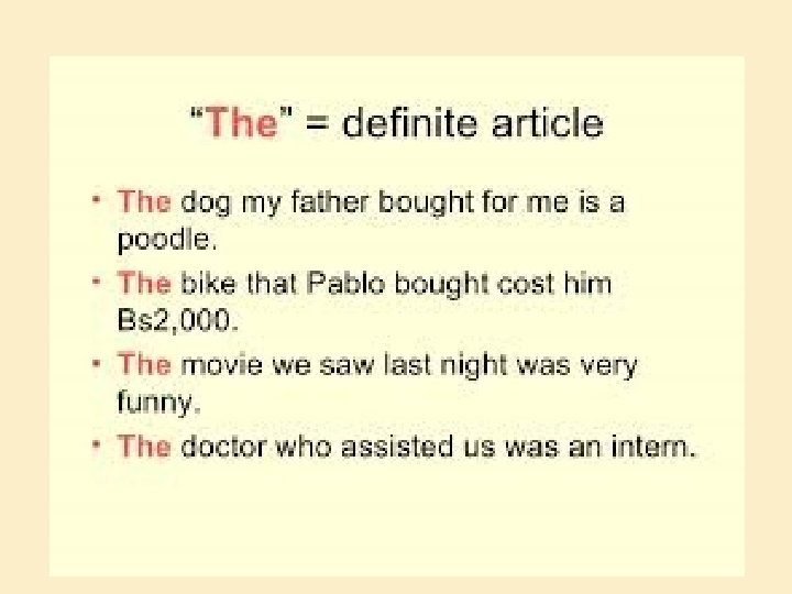 DEFINITE ARTICLE � The is called the definite Article, because it always points out some particular object. � Example : This the boy who had stolen my purse.
