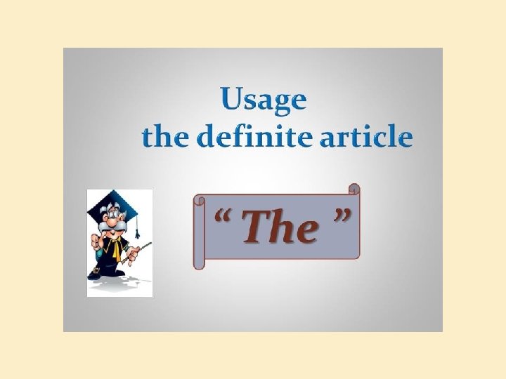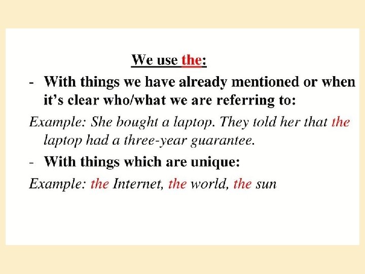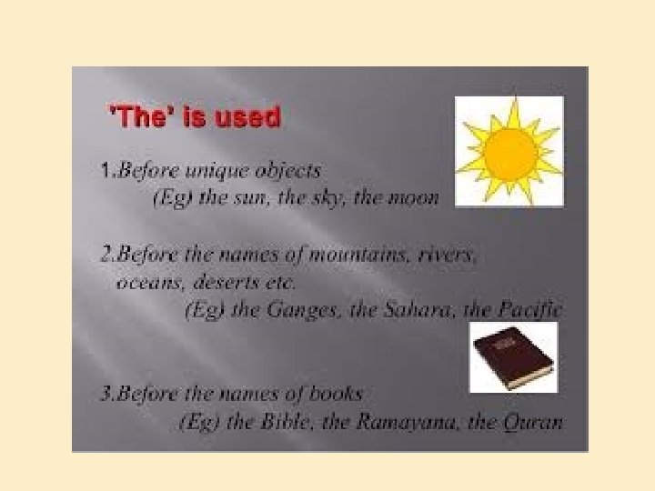 THE IS USED � The is used before a word denoting a particular person or thing. Example : Let’s go to the Cinema Before the titles : The great Before the words denoting numbers, weight – Example : cloth is sold by the metre.