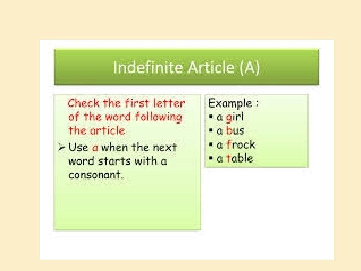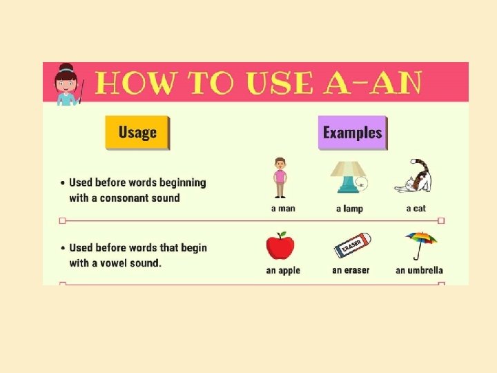 RULES A IS USED �A is used before a consonant – b, c, d, f, g, h, j, k, l, m, n, p, q, r, s, t, v, w, x, y, z � Example : a boy � a cow � a pen