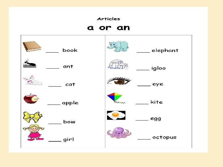 AN IS USED � AN is used before a word beginning with a vowel – a, e, i, o, u � Example : an umbrella an egg an ice cream an orange an apple