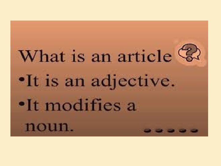 ARTICLES � Definition : - An article is a word used to modify a noun, which is a person, place , object or an idea. � Technically, an article is an Adjective, which is any word that modifies a Noun. � Usually adjectives modify nouns through description, but articles are used instead to point out or refer to nouns.