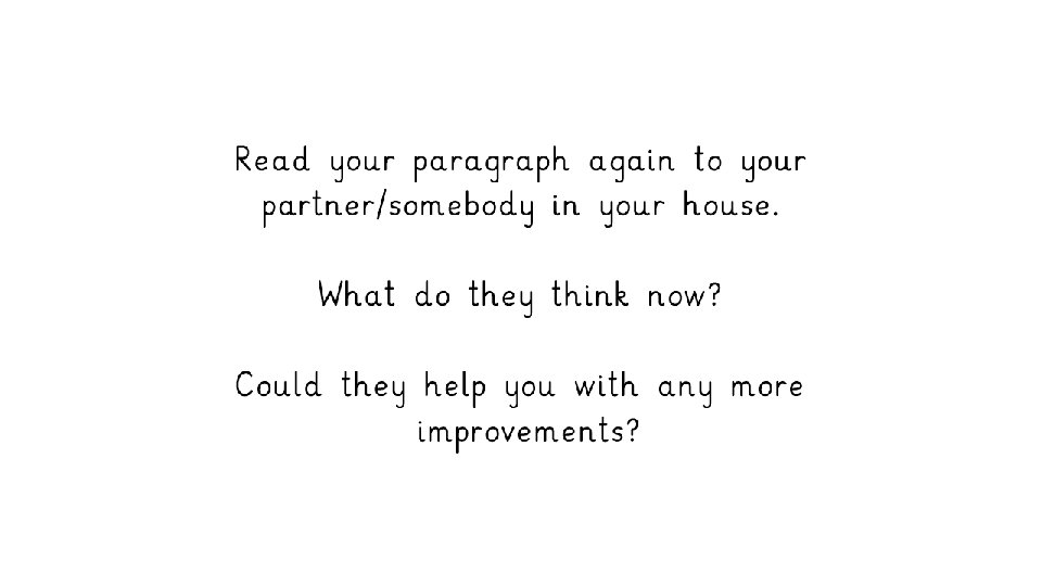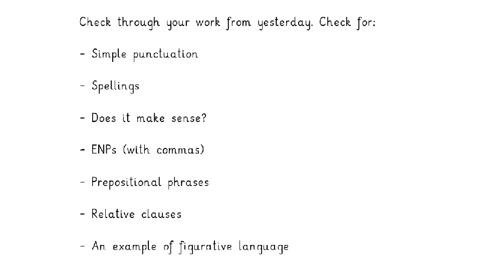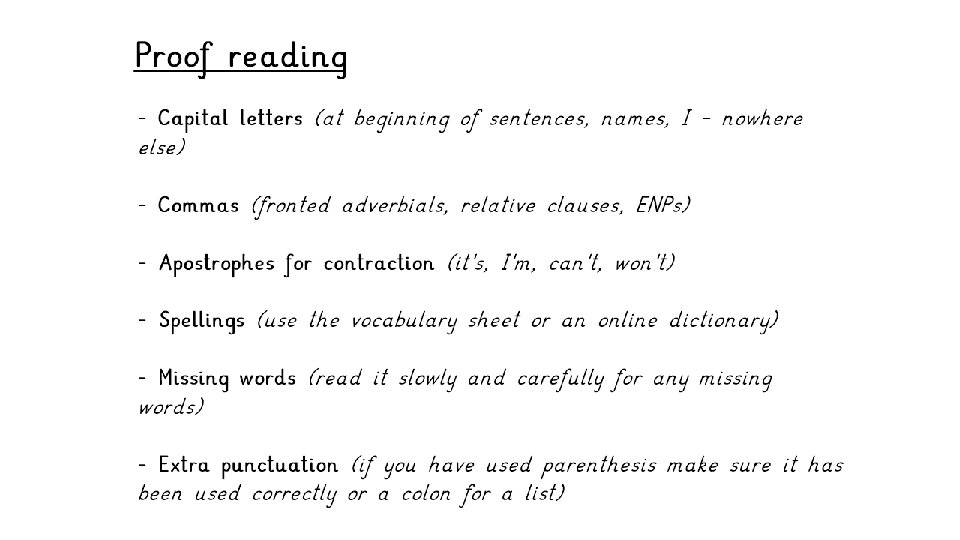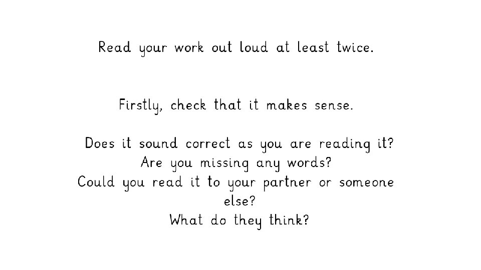 To begin with you are going to proof-read your work. This means reading through for any missing words, spelling mistakes and missing punctuation. Use the checklist on the next page to help you check. If you have another colour pen/pencil you may wish to use that, like we do at school!