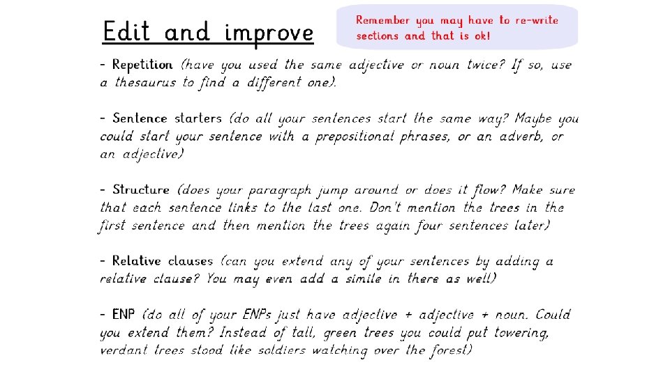 Next, you are going to edit and improve your work. This might mean taking sections out, re-writing sections, adding something in. This may get messy but you can always write a final draft once you have finished your editing!