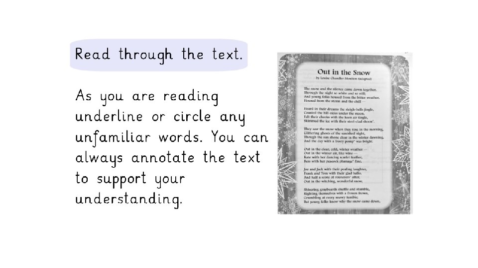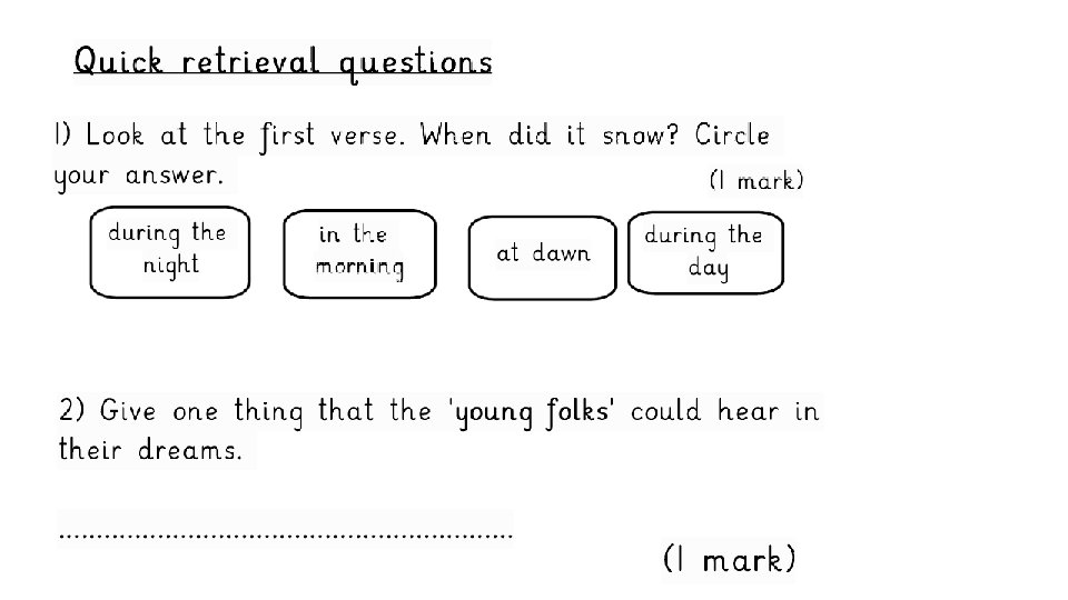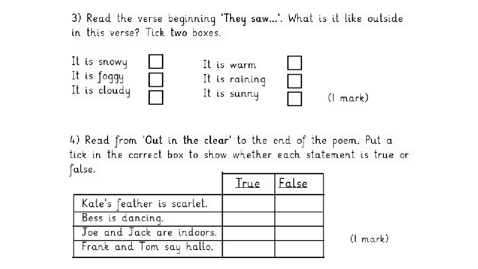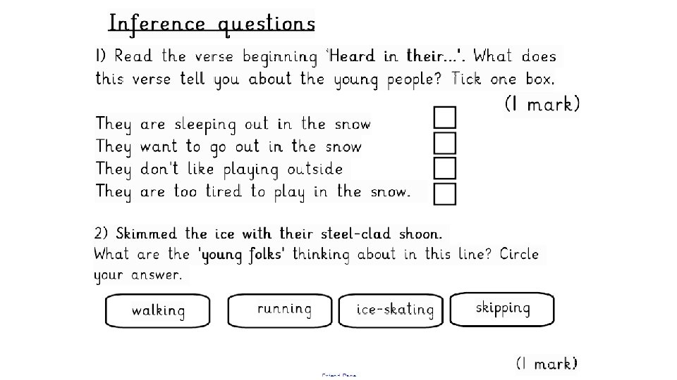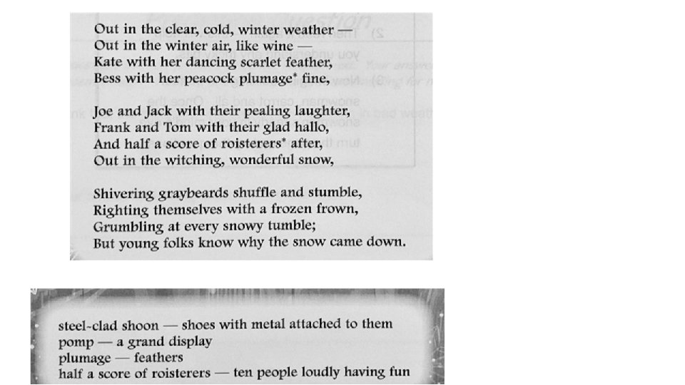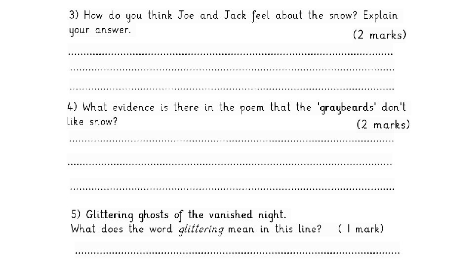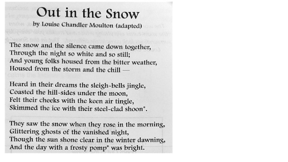 Answers 1. 2. 3. 4. 5. 6. 7. During the night Sleigh bells jingle It is sunny, It is snowy True, False, True They want to go out in the snow. Ice-skating They enjoy being in the snow, I know this because they are laughing when playing in the snow. 8. They are shuffling and stumbling which shows they might be falling over. Also they are frowning and grumbling which means that they don’t like it. 9. Glittering means that the snow is shining and sparkling because of the sunlight. 10. Different people’s experiences of the snow 11. Young people enjoy the snow