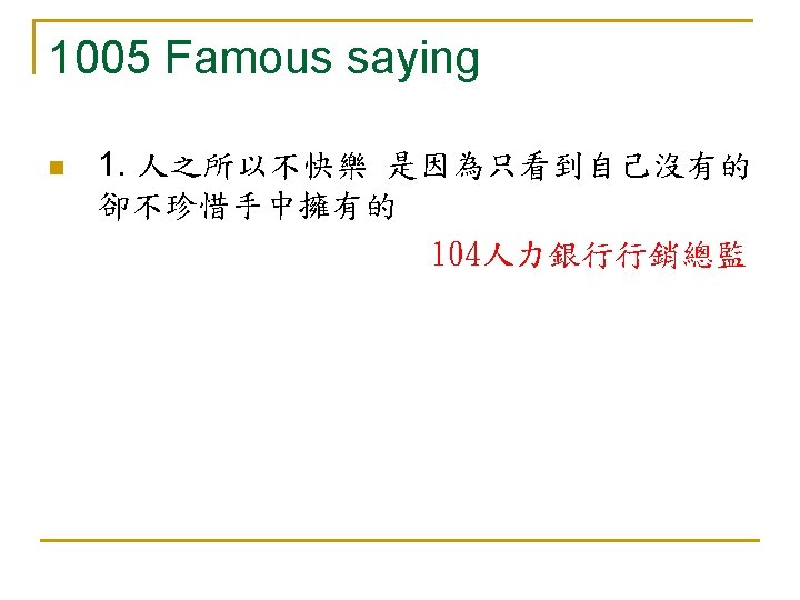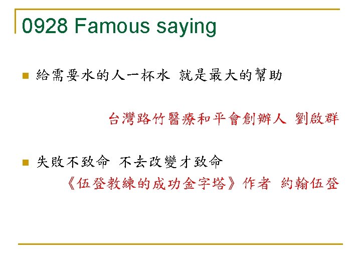 0928 Famous saying 觸動心靈的美 不見得華麗 Beauty is only skin deep. What counts lies in how you are touched by it. 作家 劉墉 n 品質比數量重要 一支全壘達遠勝兩支二壘安打 A great home run in time is more trustworthy than two base hits in a row. 蘋果電腦公司執行長 史帝夫賈伯斯 http: //www. youtube. com/watch? v=v 7 D 9 t-zu. VMo n