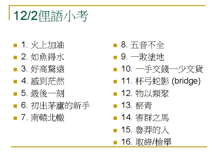12/02俚語 Slow and steady wins the race Never give in. Slow and steady wins the race. You will make it finally. n