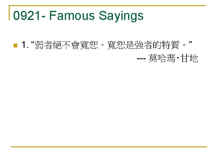 0921 - Famous Sayings 1. “The weak can never forgive. Forgiveness is the attribute of the strong. ” --- Mahatma Gandhi n