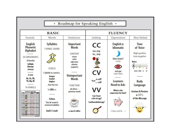 Secret Treasure in the Vowel Chart �Students understand the most important feature of English organically – you just wake it up in them �English is a stress-based language �The stressed syllable determines the color of the word �Every word in English is a color BAnana is not a word Neither is bana. NA The word is ba. NAna There are no variations. banana is a Black word