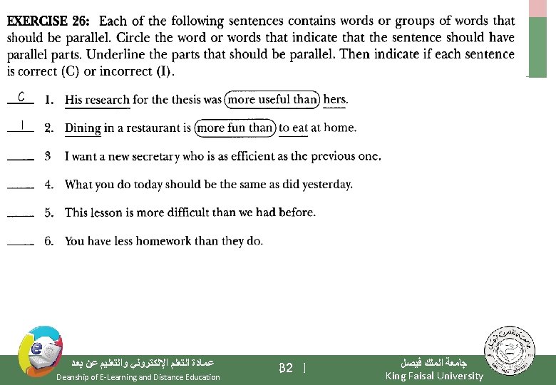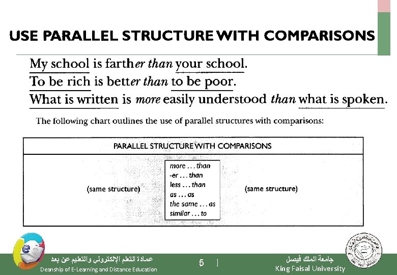 Let’s practice: • Mr. Garcia has promised me a good job and to pay me a fair salary. Mr. Garcia has promised me a good job and a fair salary. • The manager asked both groups to meet and share their differences and finally arriving at an agreement. The manager asked both groups to meet and share their differences and to arrive at an agreement. • The magazine contains news, pictures, ads, tell you where to shop, and feature columns. The magazine contains news, pictures, ads, shopping ads, and feature columns. • Tennis, modeling and to read suspense novels took up most of her time. Tennis, modeling and reading suspense novels took up most of her time. • This is the life –to live, working and cooking outdoors. This is the life –living, working and cooking outdoors. • Running towards the end zone, he slipped, got up, and was keeping on going as fast as he could. Running towards the end zone, he slipped, got up, and kept on going as fast as he could. ﻋﻤﺎﺩﺓ ﺍﻟﺘﻌﻠﻢ ﺍﻹﻟﻜﺘﺮﻭﻧﻲ ﻭﺍﻟﺘﻌﻠﻴﻢ ﻋﻦ ﺑﻌﺪ Deanship of E-Learning and Distance Education [ ] 28 ﺟﺎﻣﻌﺔ ﺍﻟﻤﻠﻚ ﻓﻴﺼﻞ King Faisal University