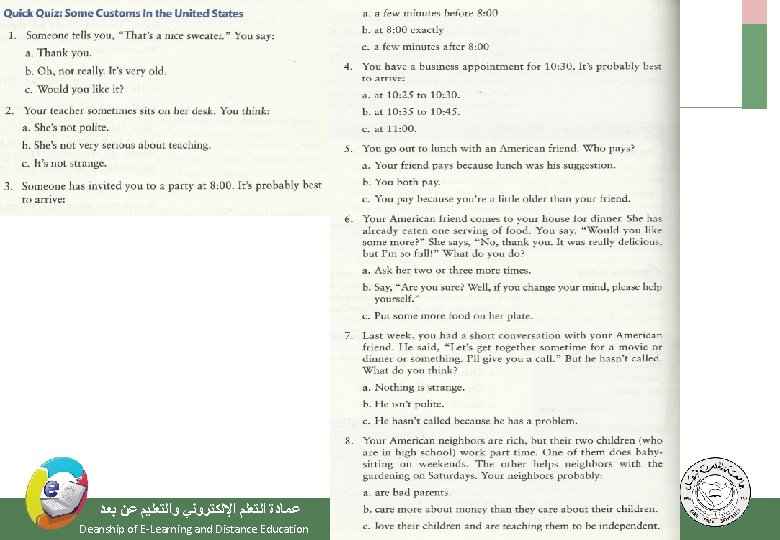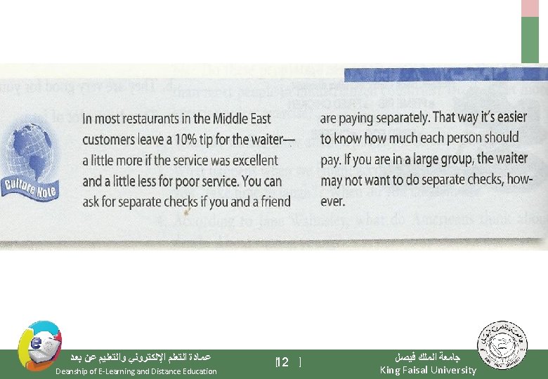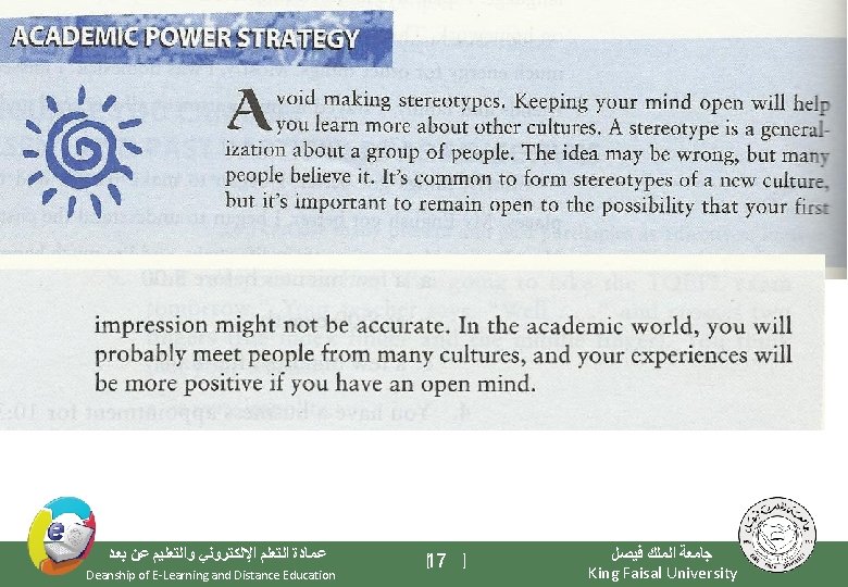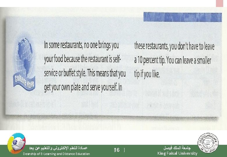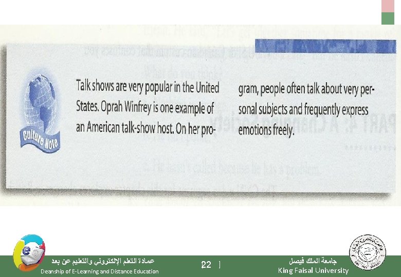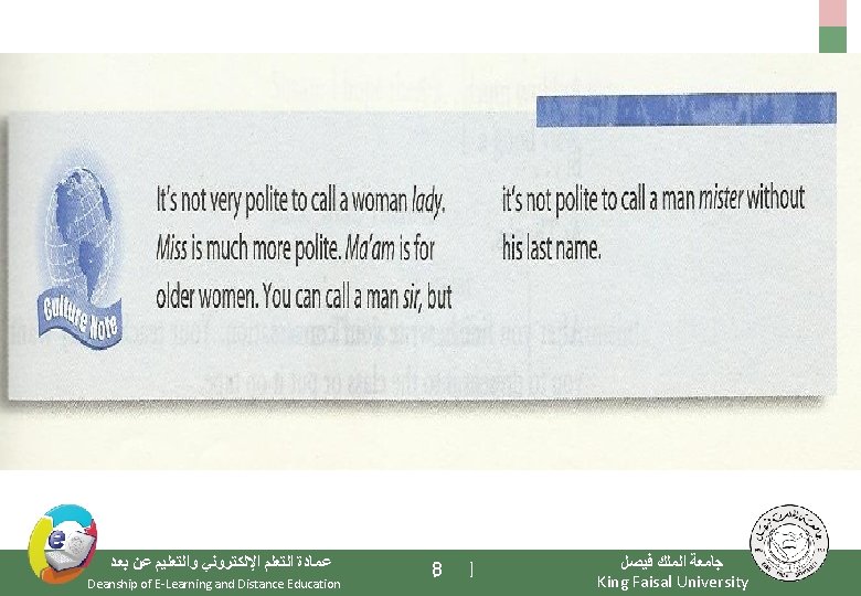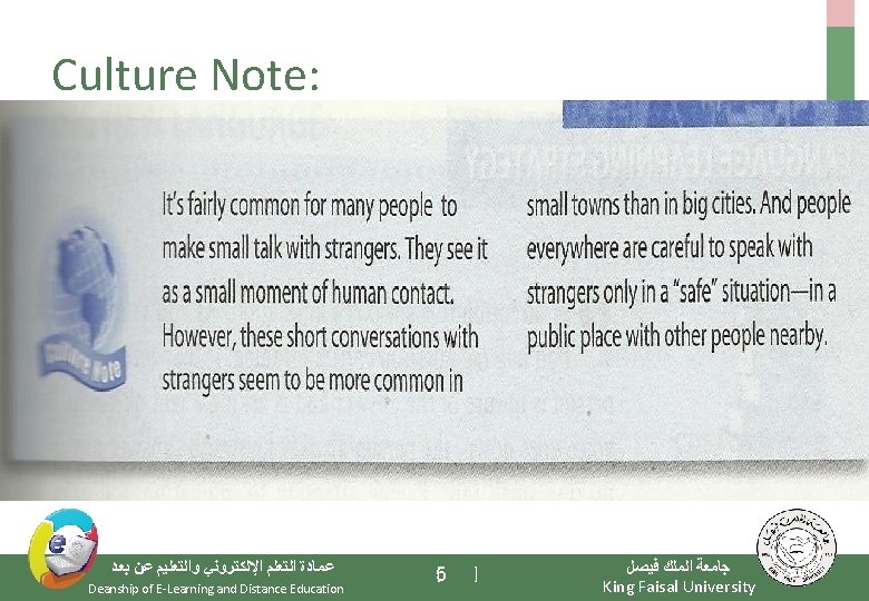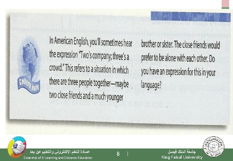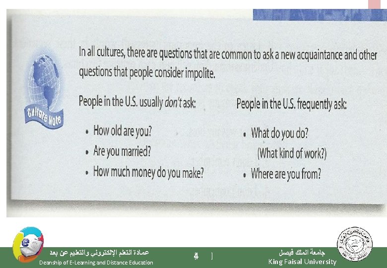 Elements of the Class - Important Warming Up Activities - Culture Notes - Vocabulary Building - Getting Meaning from Context ﻋﻤﺎﺩﺓ ﺍﻟﺘﻌﻠﻢ ﺍﻹﻟﻜﺘﺮﻭﻧﻲ ﻭﺍﻟﺘﻌﻠﻴﻢ ﻋﻦ ﺑﻌﺪ Deanship of E-Learning and Distance Education [3 ] ﺟﺎﻣﻌﺔ ﺍﻟﻤﻠﻚ ﻓﻴﺼﻞ King Faisal University
