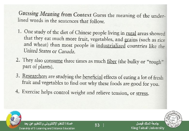 Getting Meaning from Context Definition A definition gives the meaning of words. The writer may use words, phrases, or statements to define something. The writer will use key words, or signal words to identify a definition so you need to look for them. See examples of key words below. Key words is/are means/mean is/are called what this means is is/are known as consist of is/are defined as refer to is/are described as may be seen as e. g. Someone who explores and studies caves is known as a spelunker. an unfamiliar word = spelunker signal words = is known as definition = someone who explores and studies caves ﻋﻤﺎﺩﺓ ﺍﻟﺘﻌﻠﻢ ﺍﻹﻟﻜﺘﺮﻭﻧﻲ ﻭﺍﻟﺘﻌﻠﻴﻢ ﻋﻦ ﺑﻌﺪ Deanship of E-Learning and Distance Education [14 ] ﺟﺎﻣﻌﺔ ﺍﻟﻤﻠﻚ ﻓﻴﺼﻞ King Faisal University