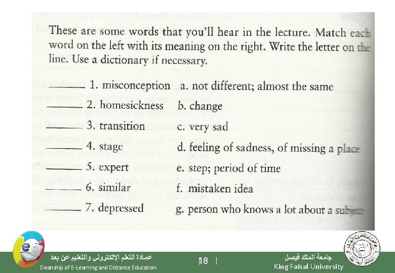 • 3. Punctuation marks Punctuation is used to describe the meaning of unfamiliar words. The writer will write unfamiliar words and then use punctuation, words, phrases, or sentences to explain the meaning of the new words. Such punctuation is in the “Key words box” below. • e. g. Full-color pictures are printed using only black and three colors: yellow, cyan (a light blue) and magenta (a light purple). , commas • an unfamiliar word = cyan and magenta signal punctuation = ( ) , , appositive • meaning : cyan = a light blue and magenta = a light purple ( ) parentheses ? ? dashes ; semicolon : colon • The use of computers to handle text, or word processing, was foreseen in the 1950 s. • an unfamiliar word = handle text signal punctuation = , , meaning : handle text = word processing ﻋﻤﺎﺩﺓ ﺍﻟﺘﻌﻠﻢ ﺍﻹﻟﻜﺘﺮﻭﻧﻲ ﻭﺍﻟﺘﻌﻠﻴﻢ ﻋﻦ ﺑﻌﺪ Deanship of E-Learning and Distance Education [20 ] ﺟﺎﻣﻌﺔ ﺍﻟﻤﻠﻚ ﻓﻴﺼﻞ King Faisal University