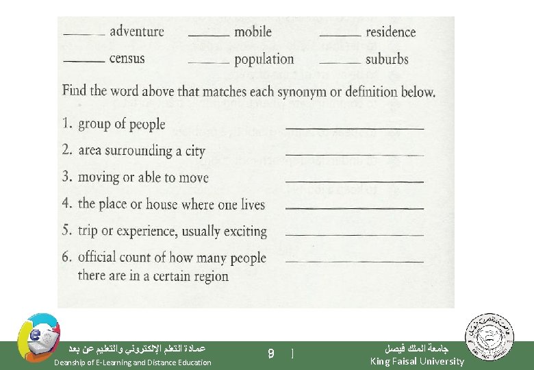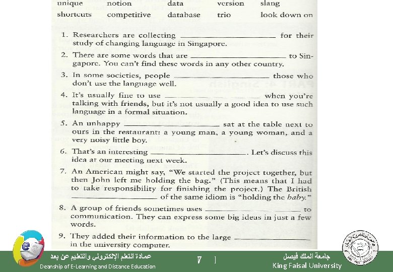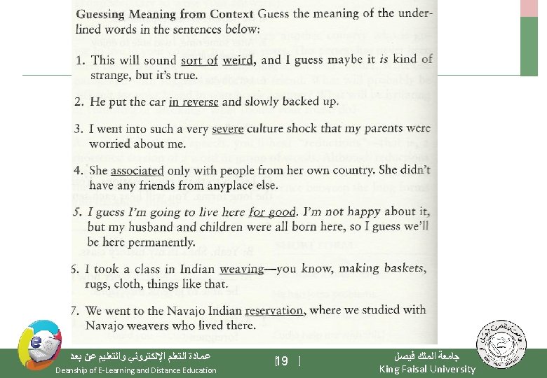 4. Examples help us to understand the meaning of new words. See key words or signal words used for showing examples in the “Key words box”. such as like for example, … for instance is / are e. g. Use navigation buttons, such as, the “Next” button, the “Previous” button, the “Menu” button, and the “Exit” button, to go back and forth or jump to other topics while you are using your English software. unfamiliar words = navigation buttons signal word = such as meaning = buttons on computer program that are used for turn on pages ﻋﻤﺎﺩﺓ ﺍﻟﺘﻌﻠﻢ ﺍﻹﻟﻜﺘﺮﻭﻧﻲ ﻭﺍﻟﺘﻌﻠﻴﻢ ﻋﻦ ﺑﻌﺪ Deanship of E-Learning and Distance Education [21 ] ﺟﺎﻣﻌﺔ ﺍﻟﻤﻠﻚ ﻓﻴﺼﻞ King Faisal University