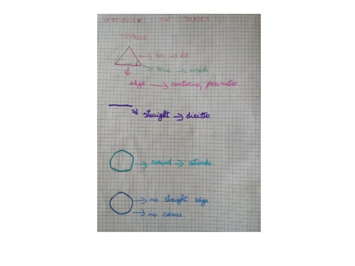 Indicando una figura per volta ne dò anche la definizione: A triangle is a shape whith three sides and three corners… A turno lo fanno anche gli alunni prima come role play poi come attività individuale sul quaderno.