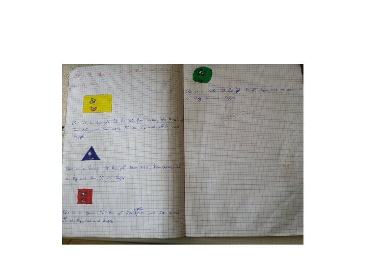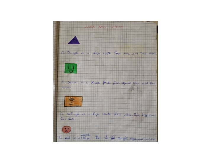 Con un’attività di draw, listen and write faccio disegnare le forme sul quaderno, dò la definizione di una figura e loro la scrivono sotto al relativo disegno