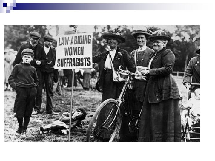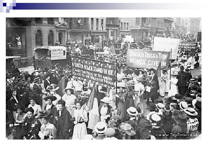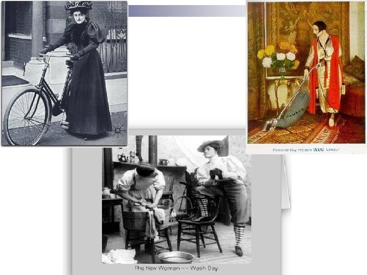 First-wave Feminism (1848 -1918) – 20 th cent. n n n suffragettes: militant and violent protesters with marching and hungerstrikes, fighting for political rights in London (e. g. Emmeline Pankhurst) – in 1918: the right to vote was granted to women suffragists: more pacifists calling for reforms in education, divorce, birth control, and fashion women worked in factories after men were enlisted during First World War image of the ‘New Woman’: independent and threatening (see also in Late Victorian Age - the vamp, and Ibsen’s Nora)