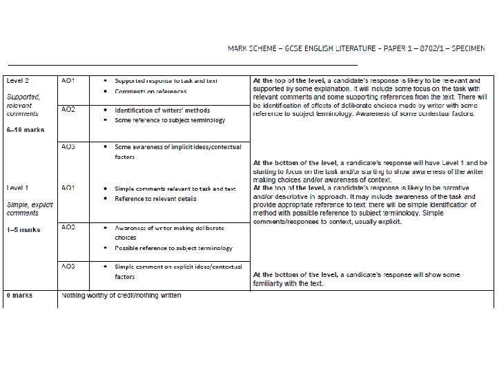 Point Make a straightforward point that answer the question: The writer uses language to present …… as being…. Evidence Embedded short quotation: This is shown when the author writes ‘………………’ Technique Label the technique the writer has used: By using this [insert device]……… (simile/metaphor/adjective/verb)… [Or Structure] – paragraphing, sentence style, punctuation, speech, narrator, 1 st person, 3 rd person, p. o. v, text type [Or Word classes, colour imagery, sensory language] Explore 1. Explain how the quotation shows that what you’ve said in the point: This suggests that…. is…because… and Explain 1. Explore the quotation in more detail: This also implies that… 1. Pick out single words and explain what they suggest 2. Explore layers of meaning; what else could a word suggest 3. Include a comment on context 4. Comment on the purpose of the writer Reader Link your exploration to the effect on the reader: Because of this, the reader… (thinks/realises/imagines/understands)… Relate Write a summary sentence(s) explaining how your paragraph answers the question.