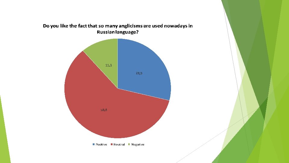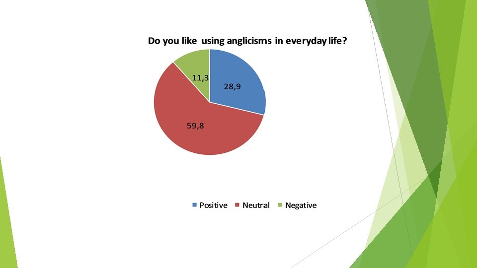 Conclusion According to the results of our research we can say that students use anglicisms not so often as it considered to be. We have found that some students don't like to use anglicisms. They prefer to use Russian words. According to the results obtained during our research work we can conclude that almost 50 per cent of students understand the people who use anglicisms and it approves our hypothesis. The purpose of the research work has been achieved.