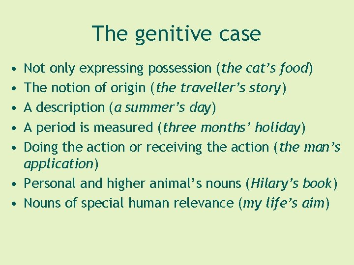The genitive case • • • Not only expressing possession (the cat’s food) The notion of origin (the traveller’s story) A description (a summer’s day) A period is measured (three months’ holiday) Doing the action or receiving the action (the man’s application) • Personal and higher animal’s nouns (Hilary’s book) • Nouns of special human relevance (my life’s aim)
