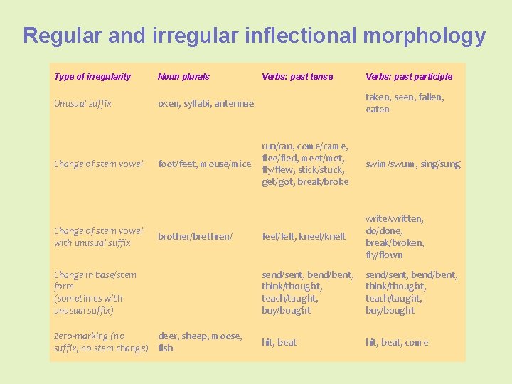 Regular and irregular inflectional morphology Type of irregularity Noun plurals Unusual suffix oxen, syllabi, antennae Verbs: past tense Verbs: past participle taken, seen, fallen, eaten run/ran, come/came, flee/fled, meet/met, fly/flew, stick/stuck, get/got, break/broke swim/swum, sing/sung feel/felt, kneel/knelt write/written, do/done, break/broken, fly/flown Change in base/stem form (sometimes with unusual suffix) send/sent, bend/bent, think/thought, teach/taught, buy/bought Zero-marking (no deer, sheep, moose, suffix, no stem change) fish hit, beat, come Change of stem vowel with unusual suffix foot/feet, mouse/mice brother/brethren/