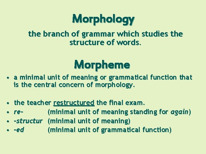 Morphology the branch of grammar which studies the structure of words. Morpheme • a minimal unit of meaning or grammatical function that is the central concern of morphology. • • the teacher restructured the final exam. re(minimal unit of meaning standing for again) -structur (minimal unit of meaning) -ed (minimal unit of grammatical function)