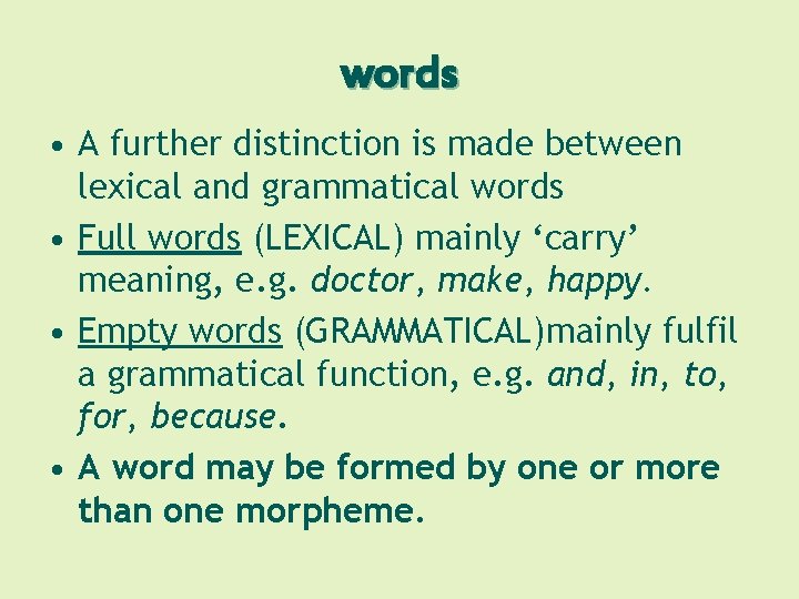 words • A further distinction is made between lexical and grammatical words • Full words (LEXICAL) mainly ‘carry’ meaning, e. g. doctor, make, happy. • Empty words (GRAMMATICAL)mainly fulfil a grammatical function, e. g. and, in, to, for, because. • A word may be formed by one or more than one morpheme.