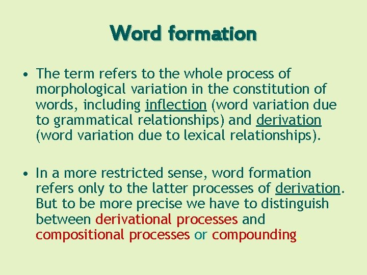 Word formation • The term refers to the whole process of morphological variation in the constitution of words, including inflection (word variation due to grammatical relationships) and derivation (word variation due to lexical relationships). • In a more restricted sense, word formation refers only to the latter processes of derivation. But to be more precise we have to distinguish between derivational processes and compositional processes or compounding.
