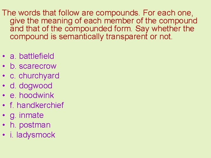 The words that follow are compounds. For each one, give the meaning of each member of the compound and that of the compounded form. Say whether the compound is semantically transparent or not. • • • a. battlefield b. scarecrow c. churchyard d. dogwood e. hoodwink f. handkerchief g. inmate h. postman i. ladysmock