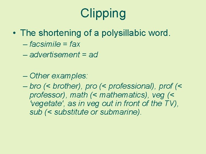 Clipping • The shortening of a polysillabic word. – facsimile = fax – advertisement = ad – Other examples: – bro (< brother), pro (< professional), prof (< professor), math (< mathematics), veg (< 'vegetate', as in veg out in front of the TV), sub (< substitute or submarine).