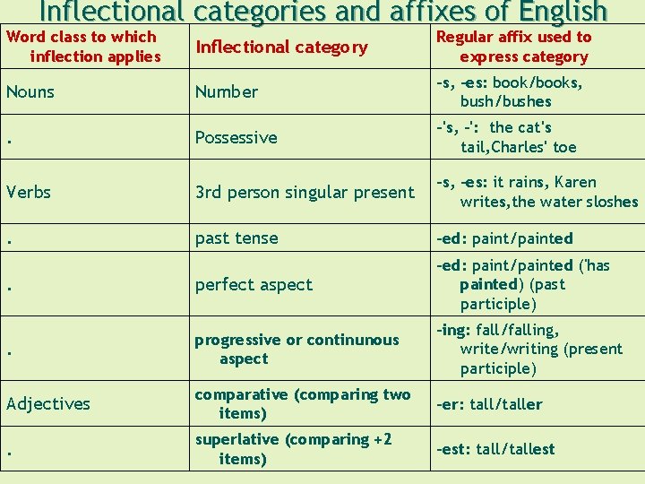 Inflectional categories and affixes of English Word class to which inflection applies Inflectional category Regular affix used to express category Nouns Number -s, -es: book/books, bush/bushes . Possessive -'s, -': the cat's tail, Charles' toe Verbs 3 rd person singular present -s, -es: it rains, Karen writes, the water sloshes . past tense -ed: paint/painted . perfect aspect -ed: paint/painted ('has painted) (past participle) . progressive or continunous aspect -ing: fall/falling, write/writing (present participle) Adjectives comparative (comparing two items) -er: tall/taller . superlative (comparing +2 items) -est: tall/tallest
